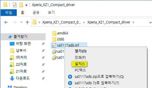 내려받은 드라이버 파일의 압축을 적당한 곳에 푼 후 'inf'파일을 찾아 마우스 우클릭하여 '설치'를 선택합니다.