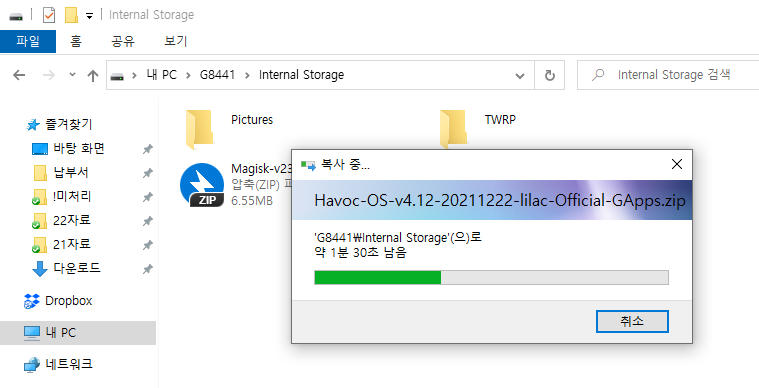 내려받은 롬파일을 벽돌이 된 xz1c의 내부에 복사한 후 기기를 PC에서 분리합니다.