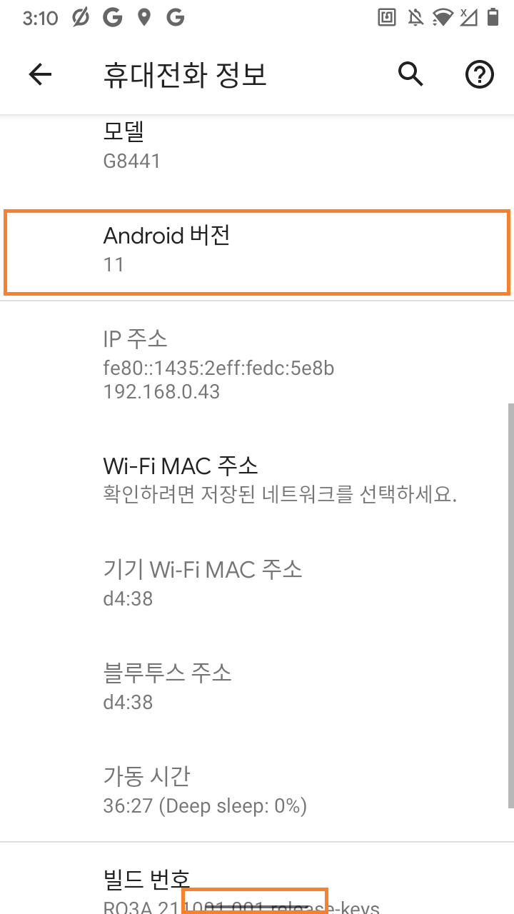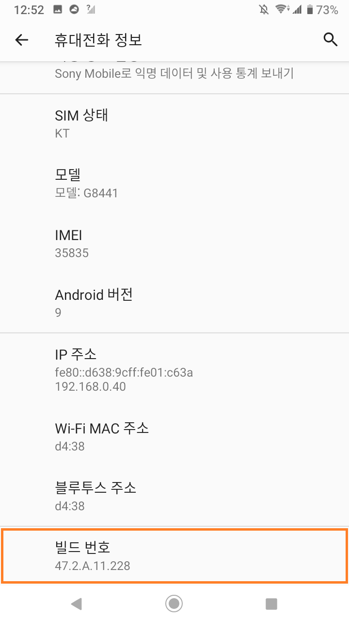 빌드번호를 7회 연타하여 개발자 옵션을 활성화합니다.