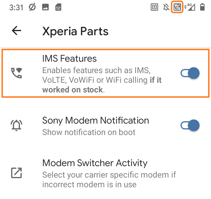 Xperia Parts에서 'IMS Features' 항목을 활성화하면 기기가 재부팅된 후 정상적으로 네트워크가 잡힙니다.