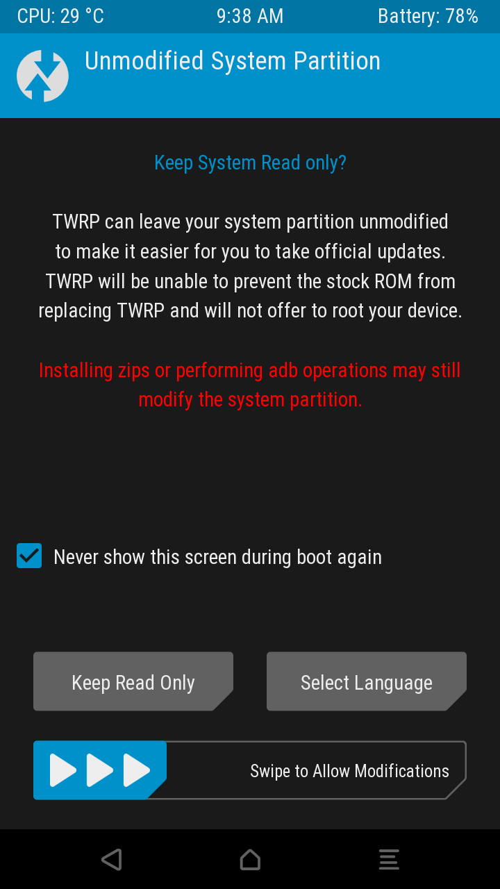 스와이프 하여 TWRP의 메인 메뉴로 진입합니다.