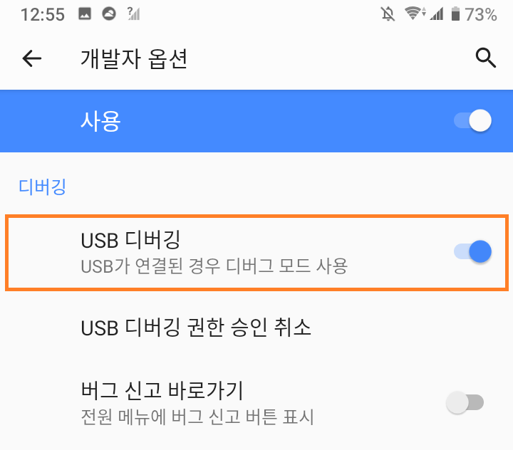 'USB 디버깅'도 활성화합니다.