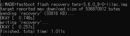 fastboot flash recovery 내려받은TWRP이미지파일명