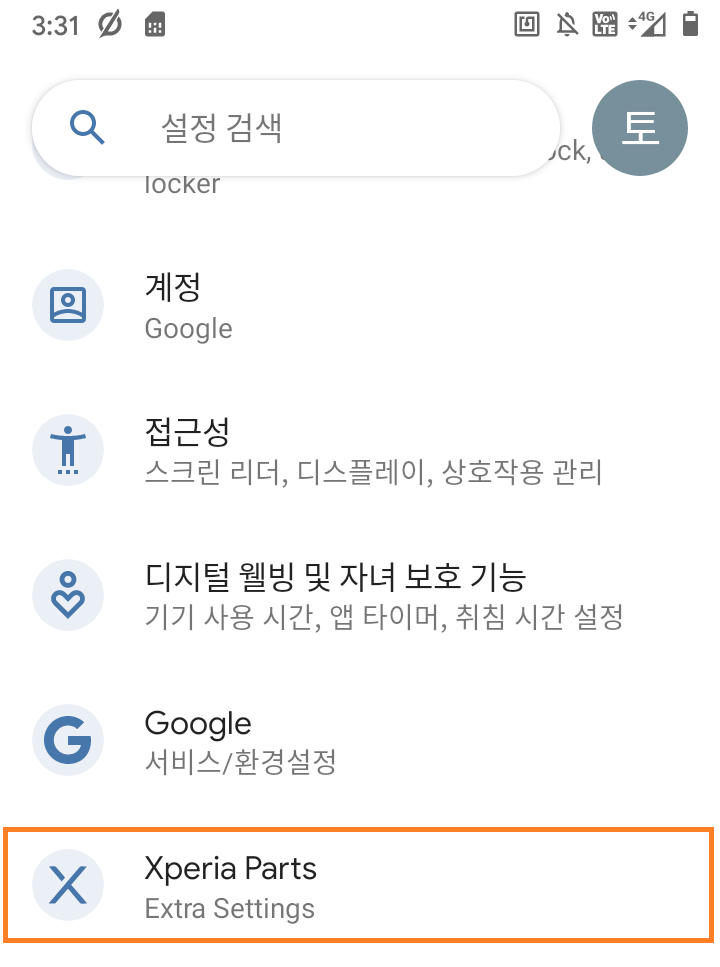 설정의 'Xperia Parts' 항목으로 진입합니다.