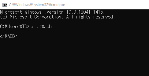 명령 프롬프트에서 'cd adb폴더경로'를 입력한 후 엔터를 입력하여 아까 압축 해제해 둔 adb 폴더로 진입합니다.