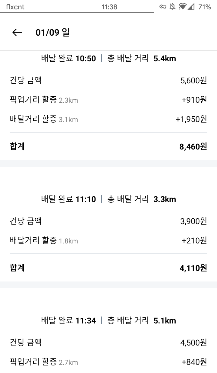 위의 배민커넥트의 배달 내역과 비교해보시면, 확실히 단가 차이는 크지 않으면서 배송거리는 아주 긴 것을 확인할 수 있습니다. 그렇기 때문에 시간당 배송 개수가 적어 수입은 적게 되나, 이동시간이 길기에 매장에 도착하면 조리가 완료되어 바로 픽업이 가능하고, 배달을 지정해주는 구역이 넓기 때문에 집에서만 앱을 켜도 보통 바로바로 배송이 잡힙니다.
