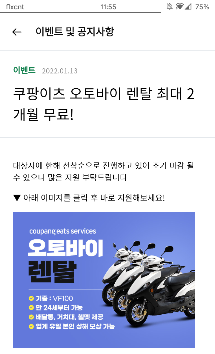 그런데 쿠팡이츠는 원동기를 렌털 해주는 서비스사와 제휴를 맺고 있습니다.