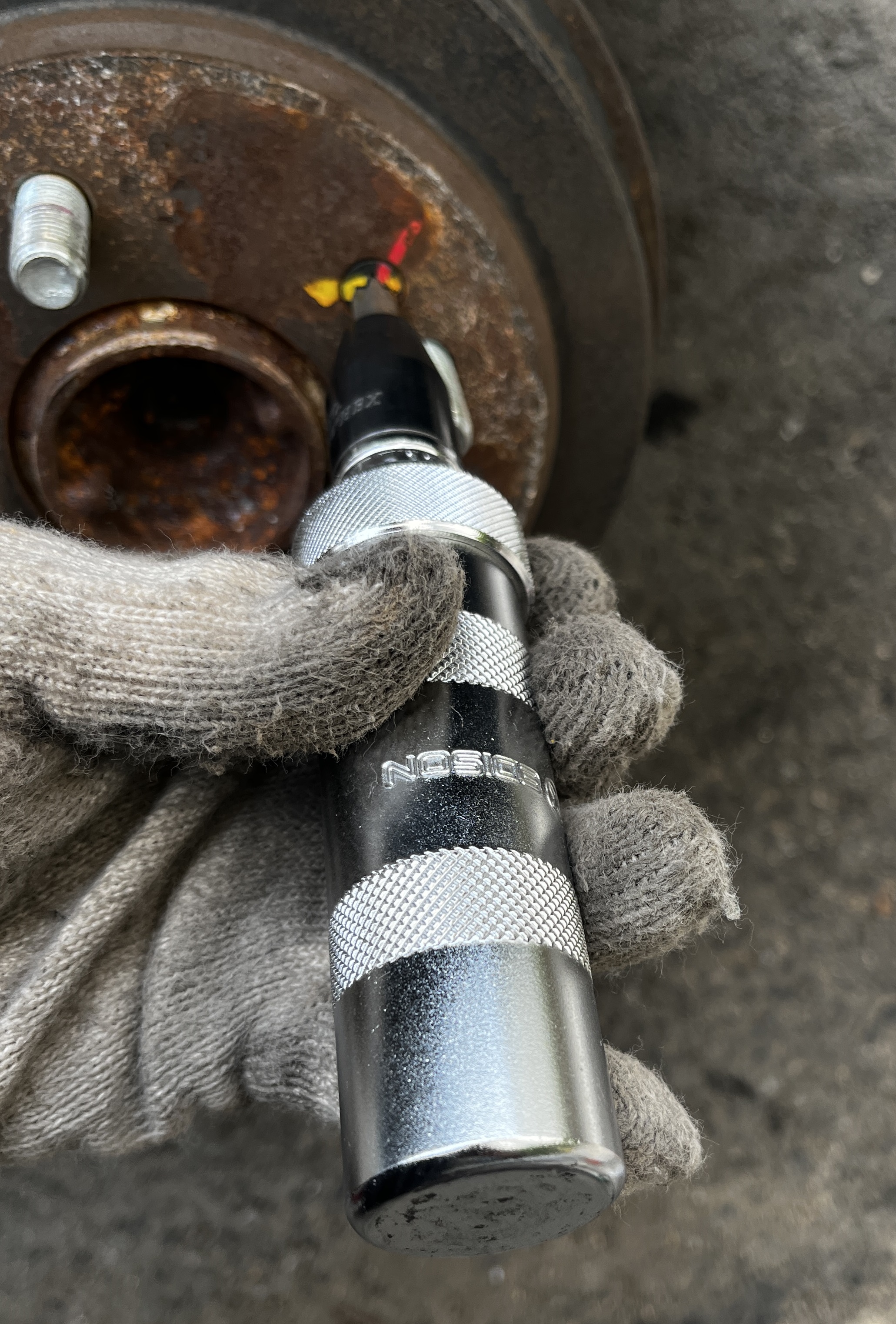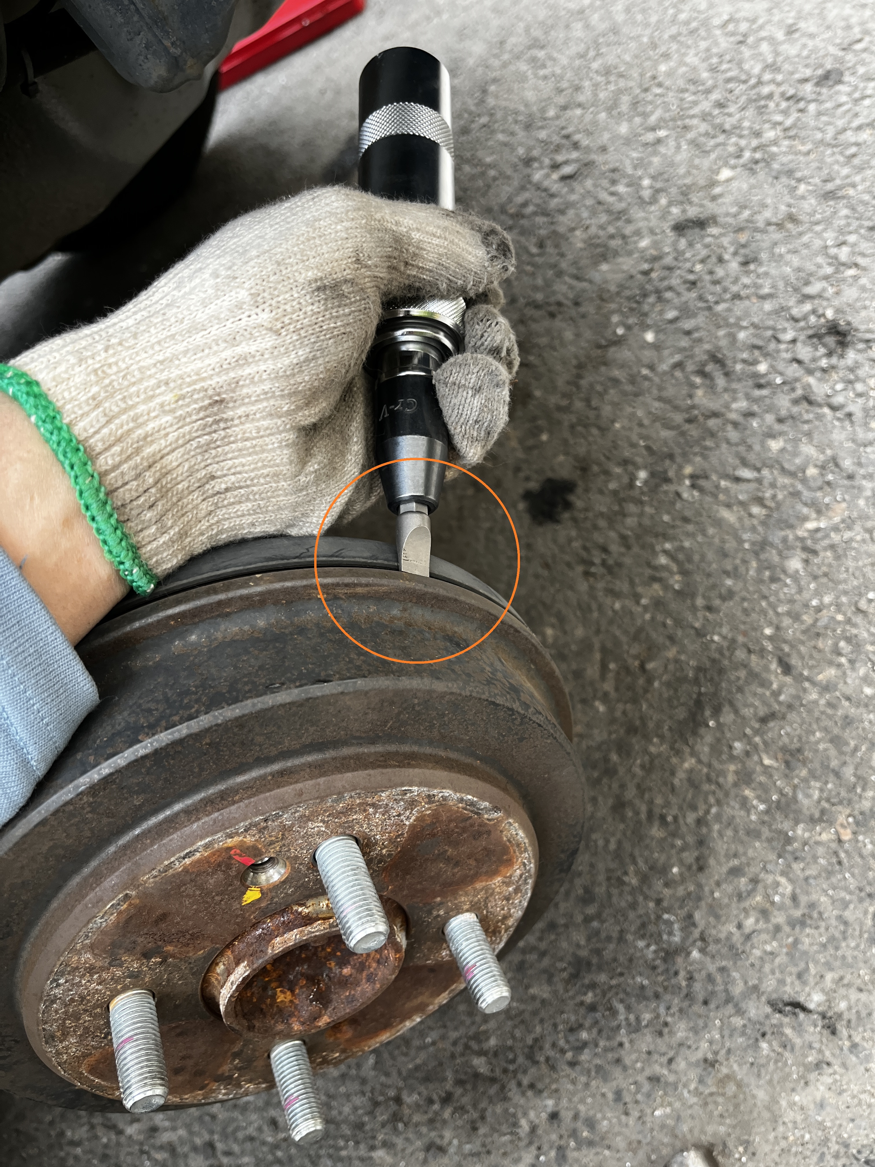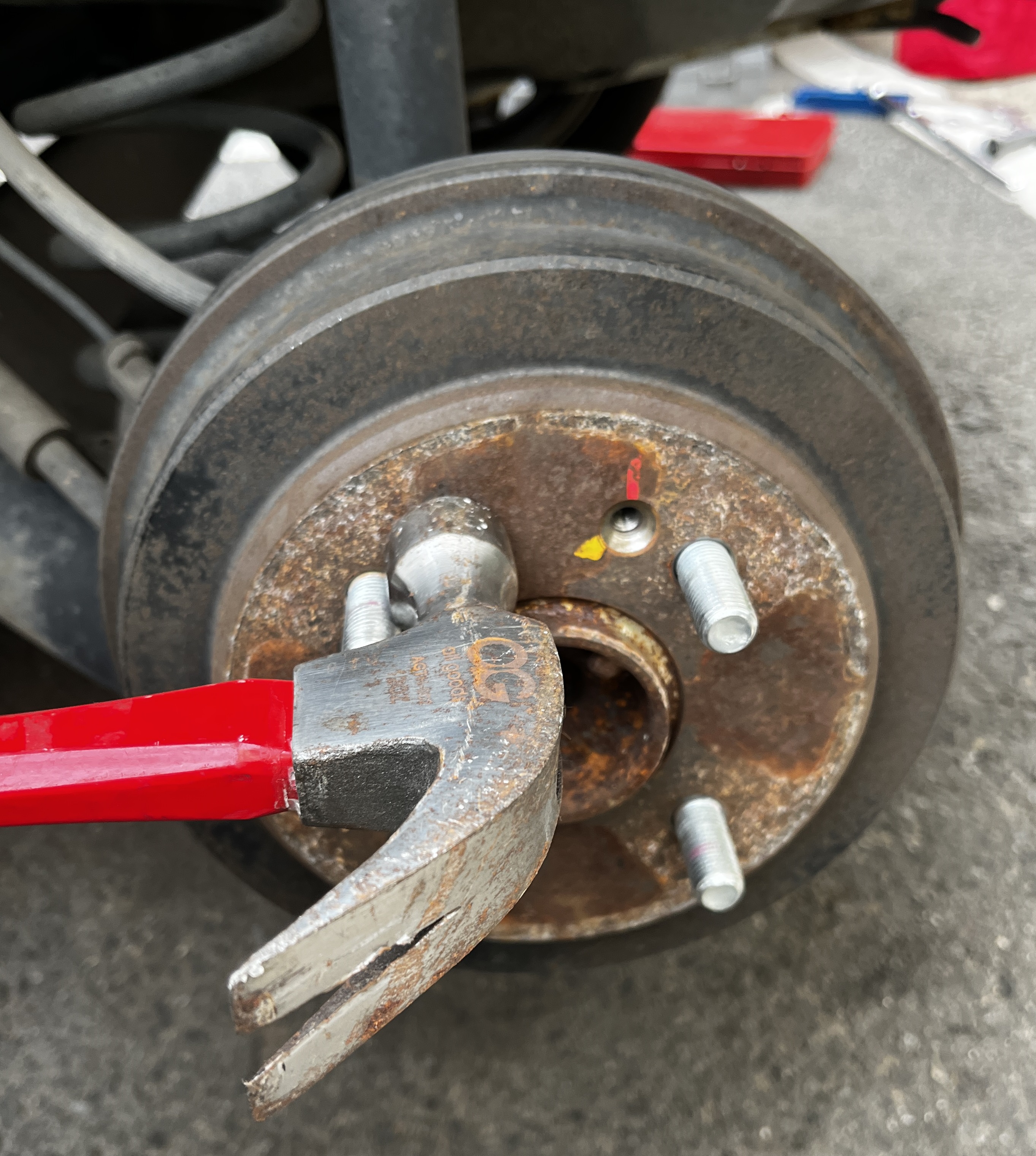 임팩드라이버를 브레이크 디스크 스크류에 위치하고 망치로 때려주면 위처럼 나사가 풀립니다.