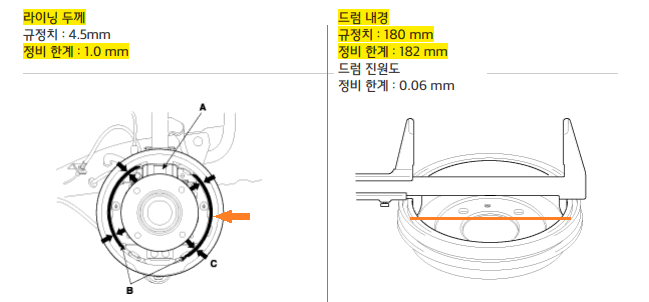 기아의 정비지침서상에는 브레이크 패드의 경우 1.0 mm 미만, 드럼의 경우 내경이 182 mm 이상이 되면 교환하라고 안내하고 있습니다.