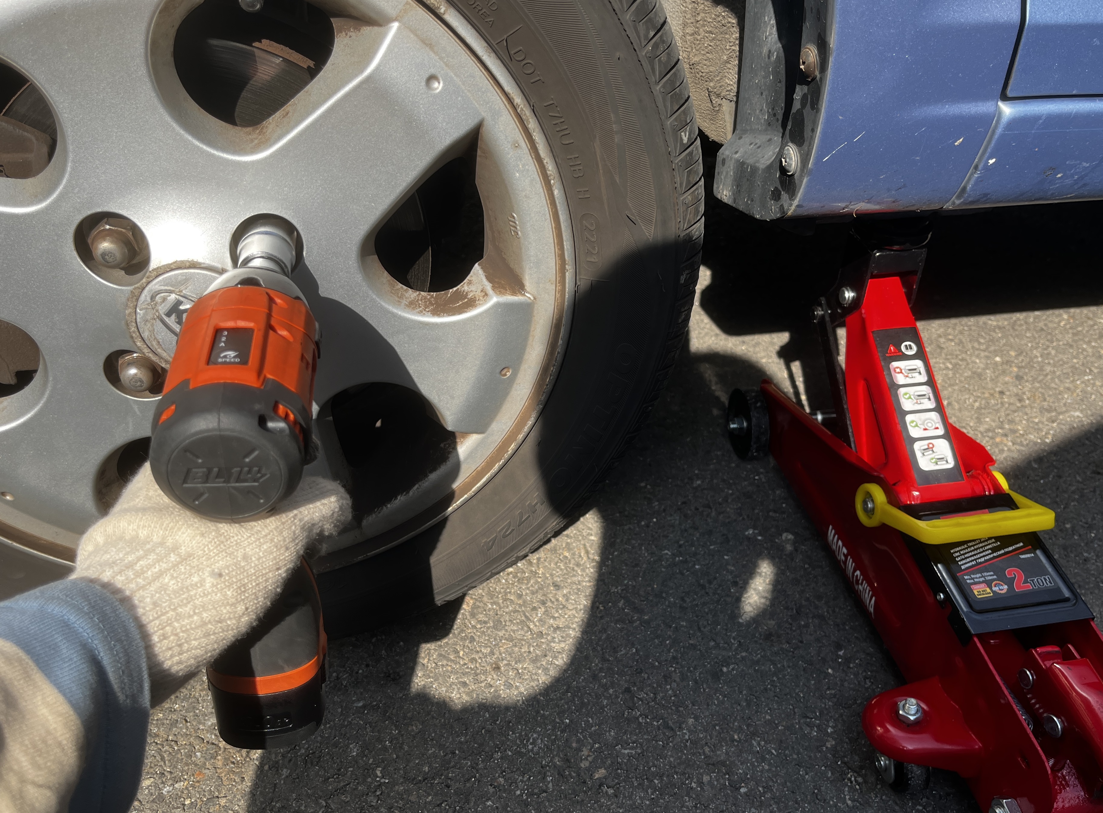 임팩드릴이 없는 경우 차를 띄우기 전 미리 휠너트를 조금씩 풀어두어야 휠너트 풀기가 쉽습니다.