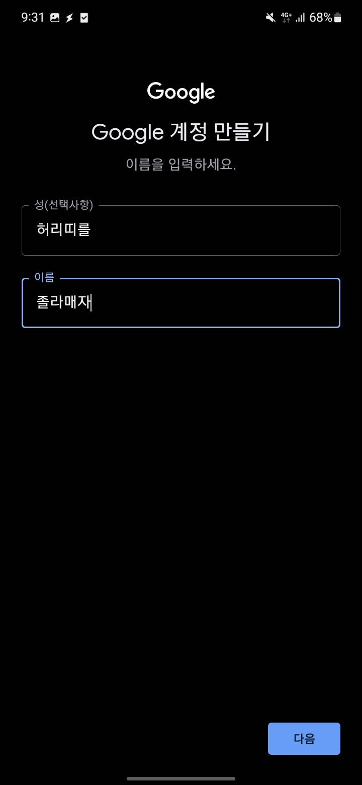 이후 쭉쭉 계속하여 '계정 만들기'까지 진행하면 전화번호 없는 구글 계정이 생성되었습니다.