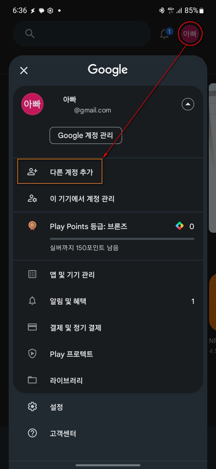 플레이스토어 우상단의 계정 아이콘을 누른 후 '다른 계정 추가'를 누릅니다.