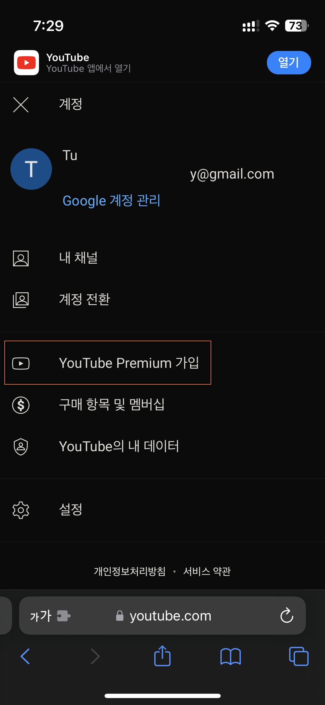 지역이 터키인 것을 확인 한 이후 다시 계정 부분에서 'YouTube Premium 가입'을 눌러봅니다.