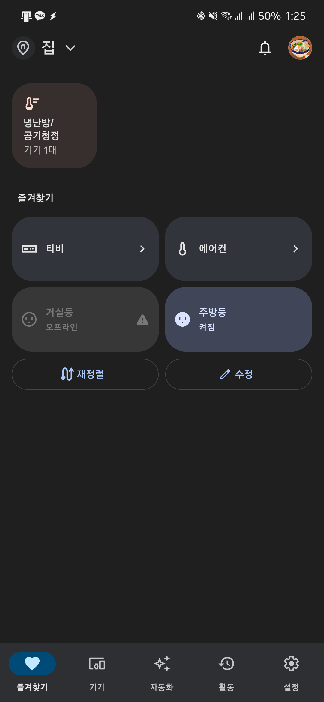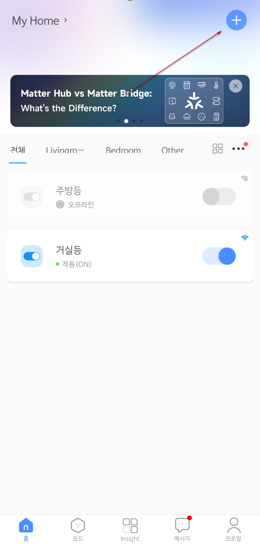스위치가 추가되면 다시 첫 번째 사진처럼 사용할 수 있는 기기가 나오며, 저 화면에서 터치로 조명을 켜거나 끌 수 있습니다.