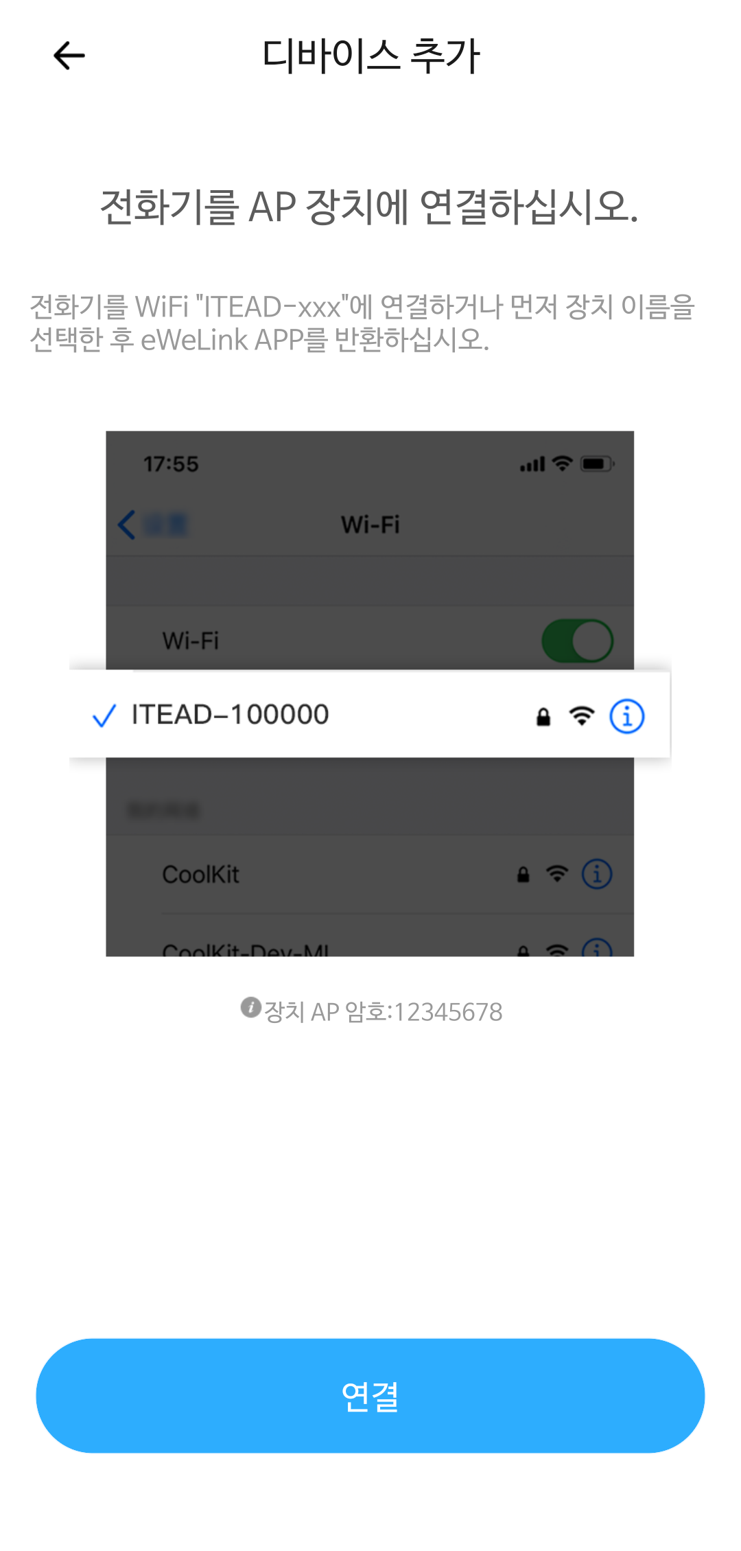 먼저 연결에 사용할 스마트폰이나 태블릿이 와이파이에 연결되어 있어야 하며 2.4G 대역의 Wifi만 지원합니다.