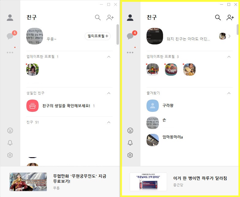 위와 같이 업무용으로 사용할 PC 카카오톡이 중복으로 실행되며, 샌드박스로 실행된 앱은 갈무리처럼 프로그램의 가장자리에 노랑 테두리가 있어 기본으로 실행된 앱과 구분이 가능합니다.