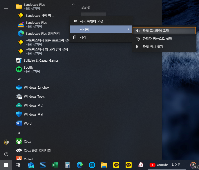 설치가 끝나고 나면 윈도우즈의 시작 메뉴에 샌드박스가 새로 생기게 되는데 'Sandboxie 시작 메뉴' 항목에서 마우스 우클릭하여 '자세히 → 작업 표시줄에 고정'을 해줍니다.