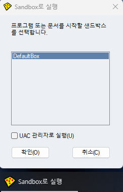 작업표시줄에서 'Sandboxie 시작 메뉴'를 클릭하면 위와 같은 팝업이 열리는데 '확인'을 눌러줍니다.