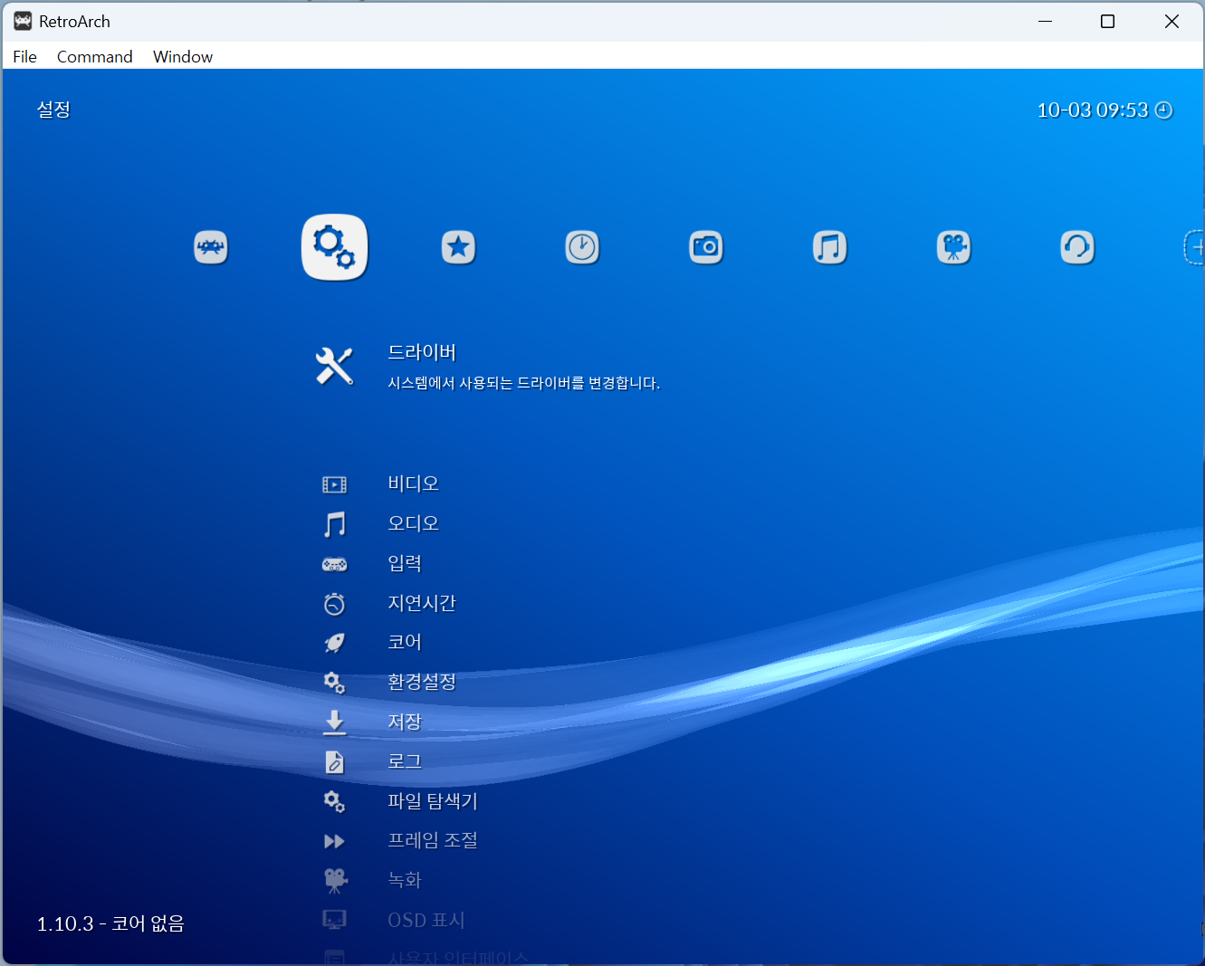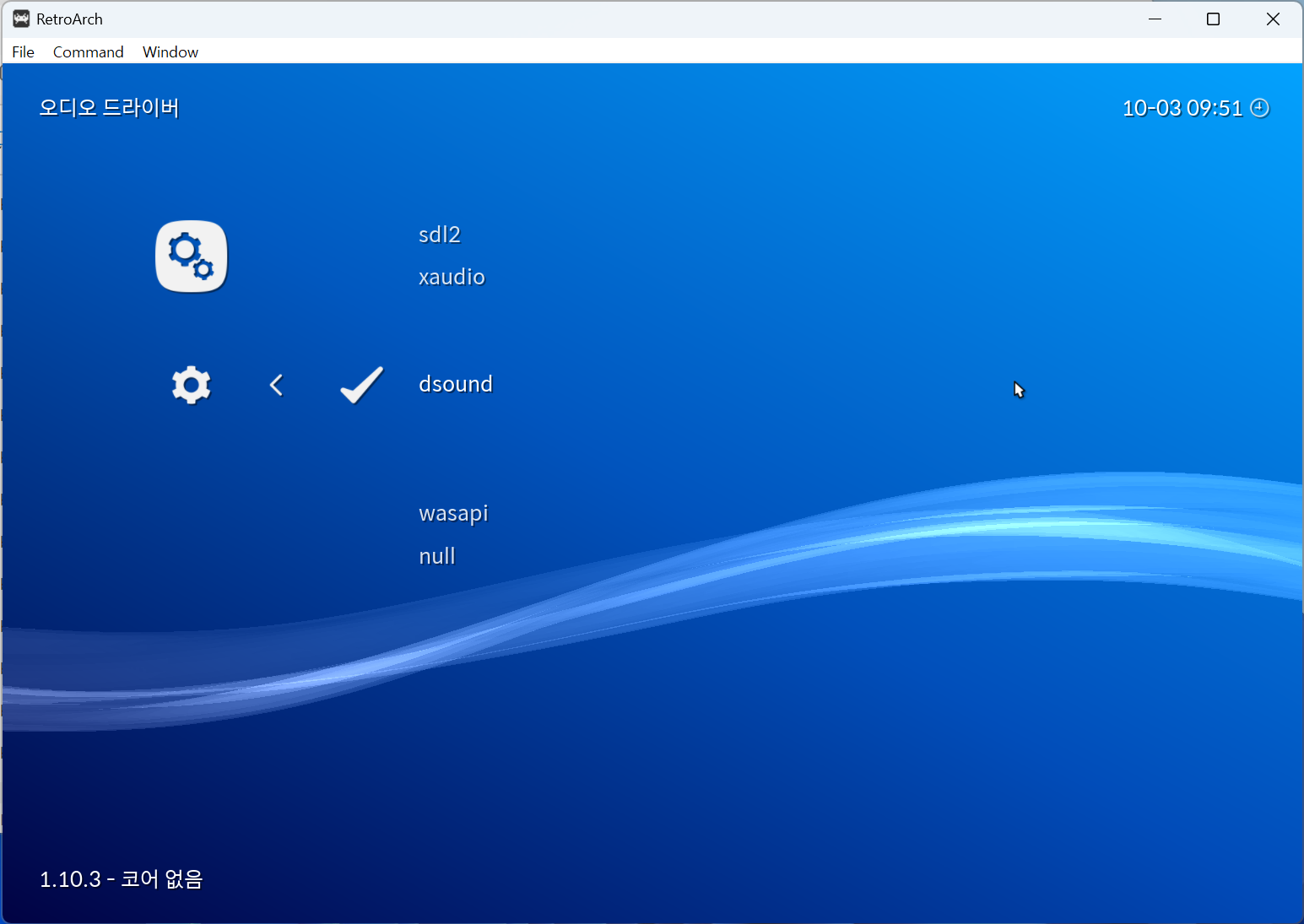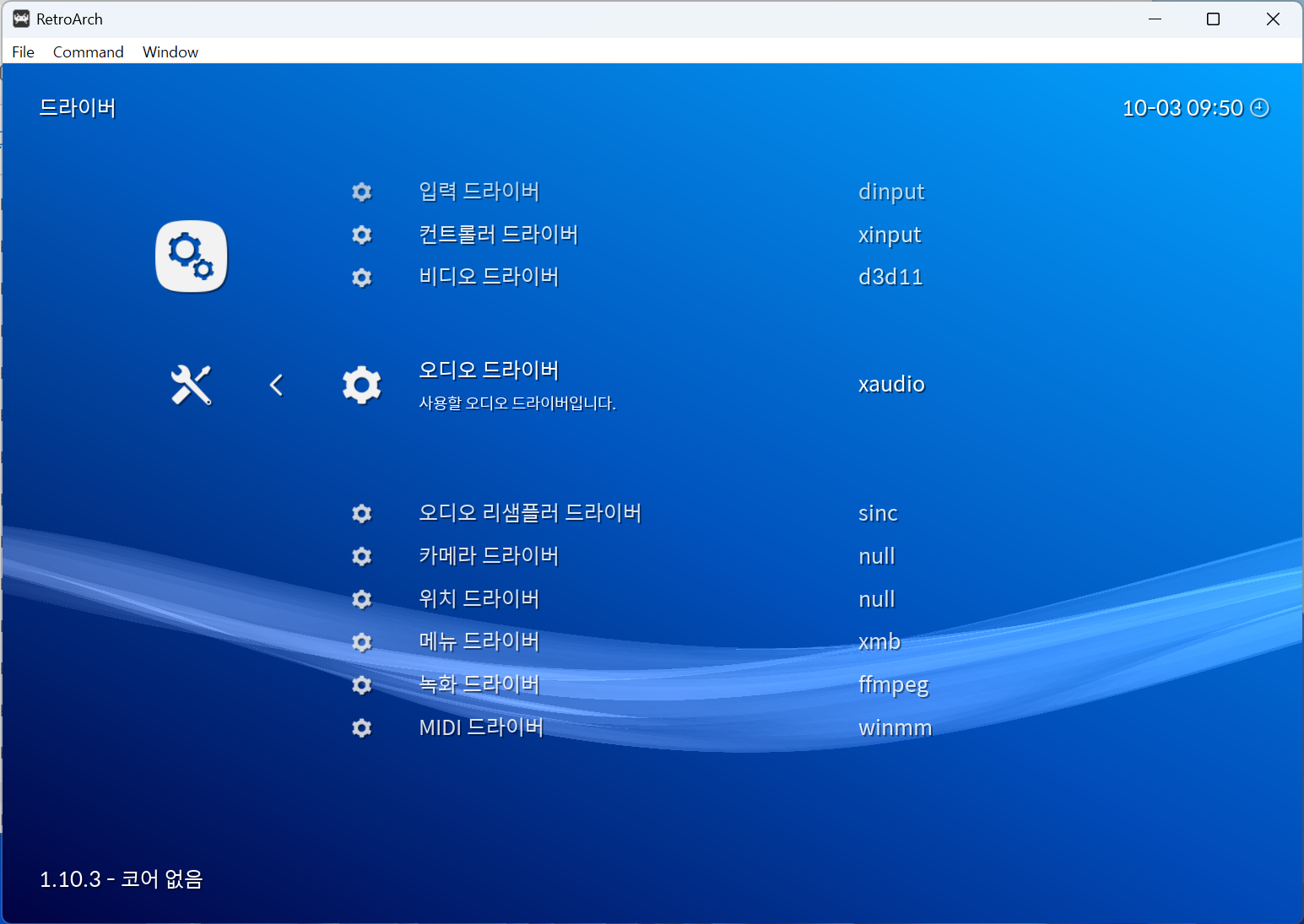 이후 레트로아크 설정 메뉴로 진입하여 '드라이버 → 오디오 드라이버' 메뉴로 진입합니다.