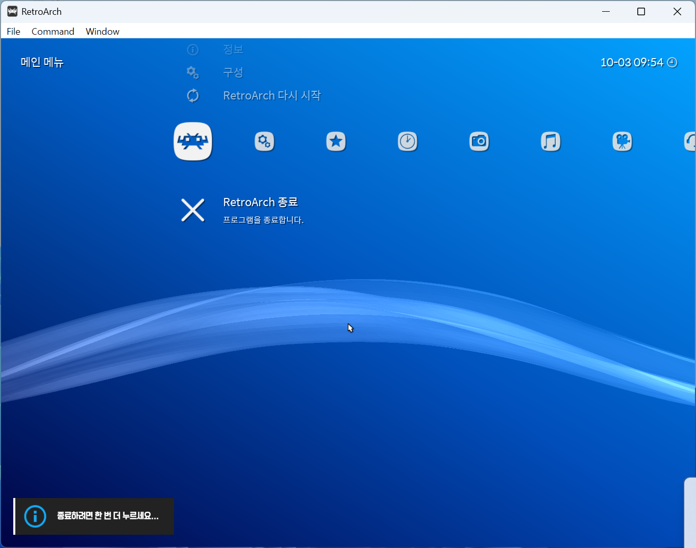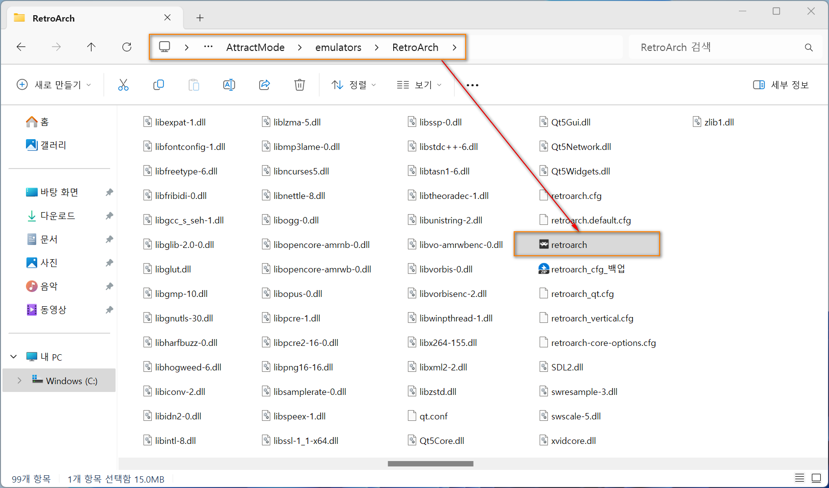 저와 같은 증상이 있는 경우에는 어트랙트모드가 있는 폴더 하위의 'emulators → RetroArch' 폴더 내의 'retroarch.exe'를 실행해 줍니다.