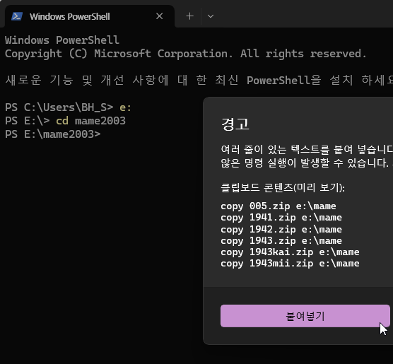 경고창이 열리는데 '붙여넣기'를 클릭해 주면 됩니다.