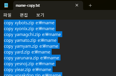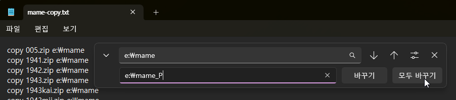 메모장에서 위에서 내려받은 부모롬 목록 파일을 열어준 후 'Ctrl+F'를 눌려 열리는 메뉴에서 'e:\mame' 폴더를 부모롬을 복사할 새로운 폴더 경로를 지정한 후 '모두 바꾸기'를 눌러줍니다.