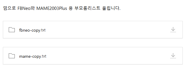 위의 파일에는 FBNeo와 Mame2003 plus의 부모롬 목록만이 들어 있습니다.