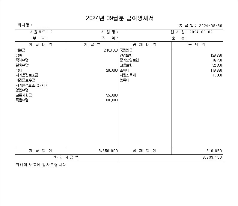 세무사랑에서 급여명세서를 기본 설정으로 출력하면 위와 같이 한 장에 두 명씩 출력이 되는데, A4에 출력하여 문서를 자르는 등의 작업이 또 필요하기 때문에 거래처에서 한 페이지에 한 명씩만 출력되게 해달라고 요청하는 경우가 있습니다.