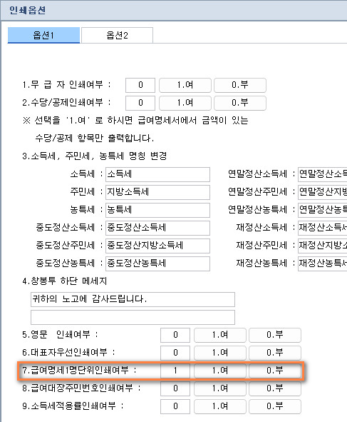 이런 경우 '급여자료입력' 메뉴의 '인쇄' 메뉴 하위의 '인쇄옵션'을 변경해 주면 됩니다.