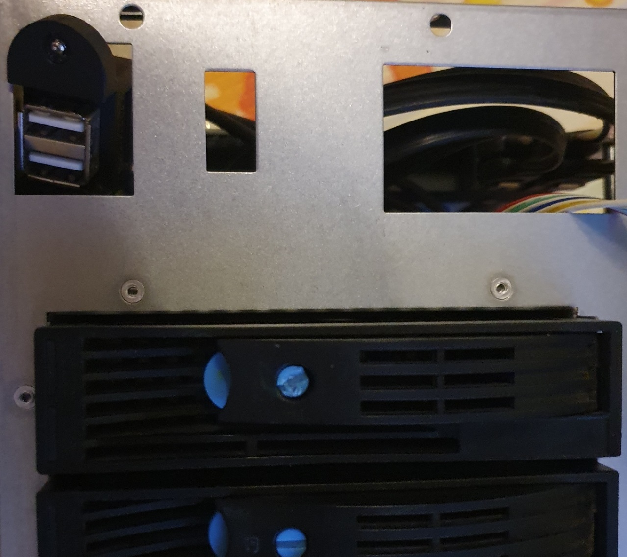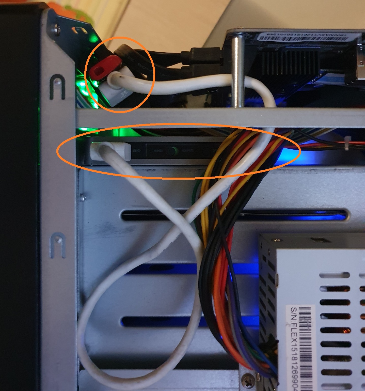 기기 내부에 때마침 2.5인치 외장하드 케이스가 들어갈만한 공간이 있어 2.5인치 HDD를 잘 거치하였고, 부팅용 USB와 외장하드케이스용 USB를 전면부 USB 단자에 삽입하였습니다.