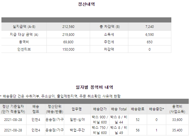 총 108건에 대한 급여로 212,560원이 입금되었으며, 나중에 알고 보니 첫배송 15만 원 프로모션 15만 원 추가 지급이 있었습니다.