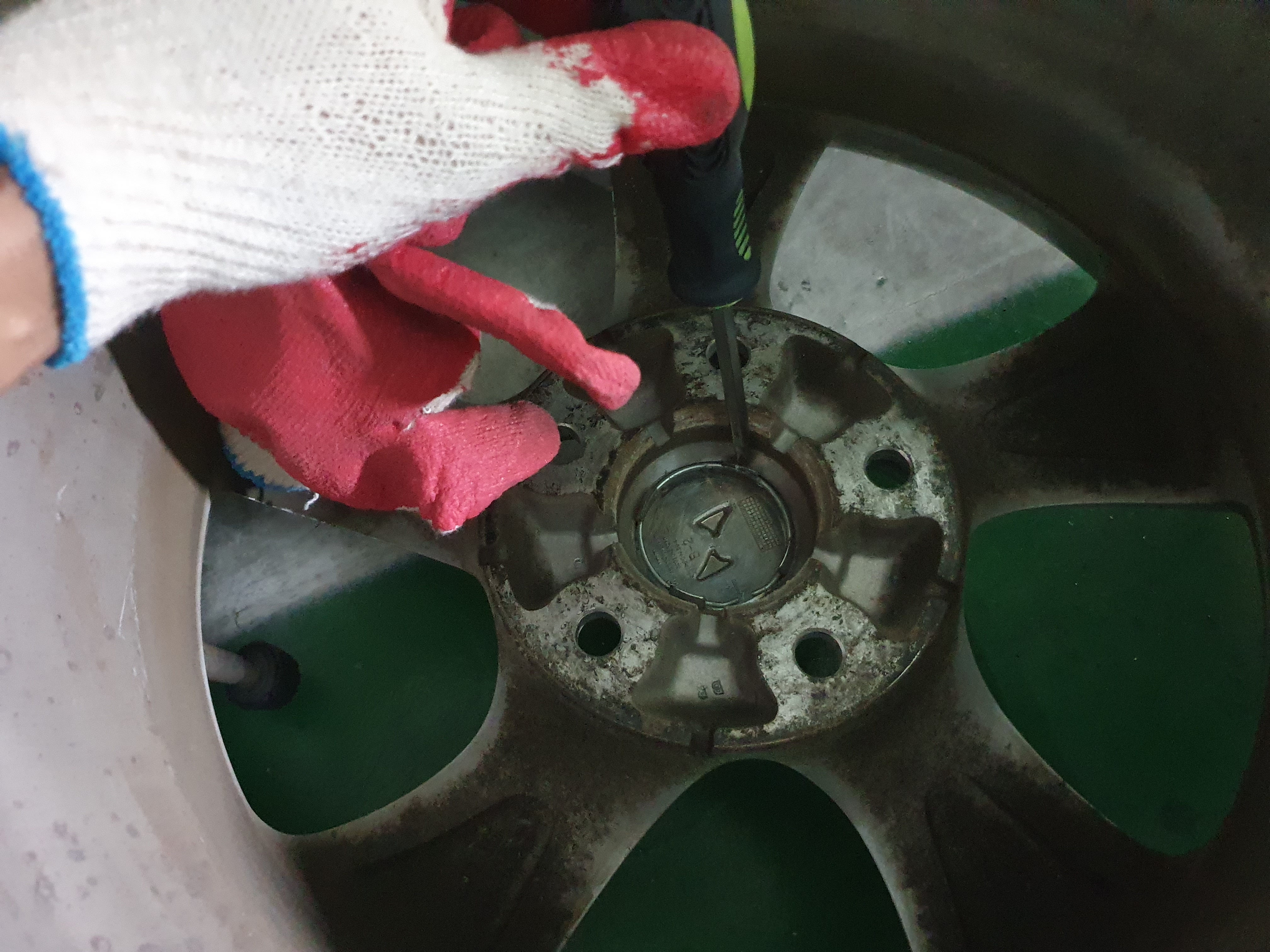 휠을 탈거하고 안쪽면에서 중앙의 현대자동차 로고가 각인된 플라스틱 부품을 밀어 탈거하였습니다.