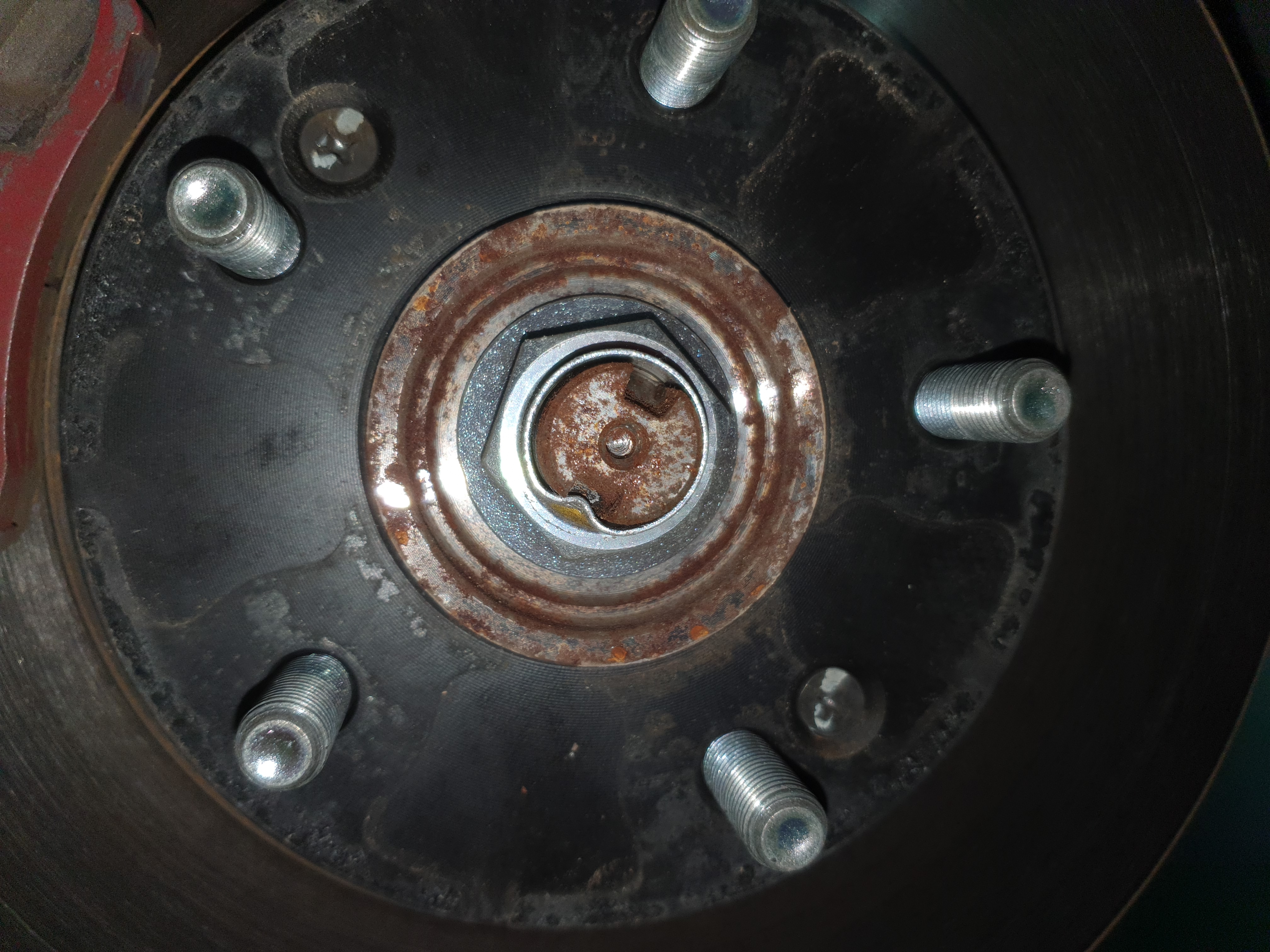 바퀴가 탈거된 위치에는 이렇게 코킹너트가 있는데 회전하지 않도록 한쪽이 찌그러져 있습니다.