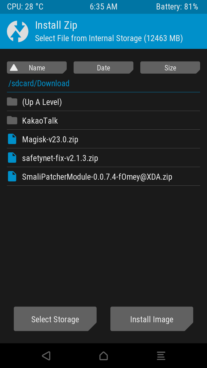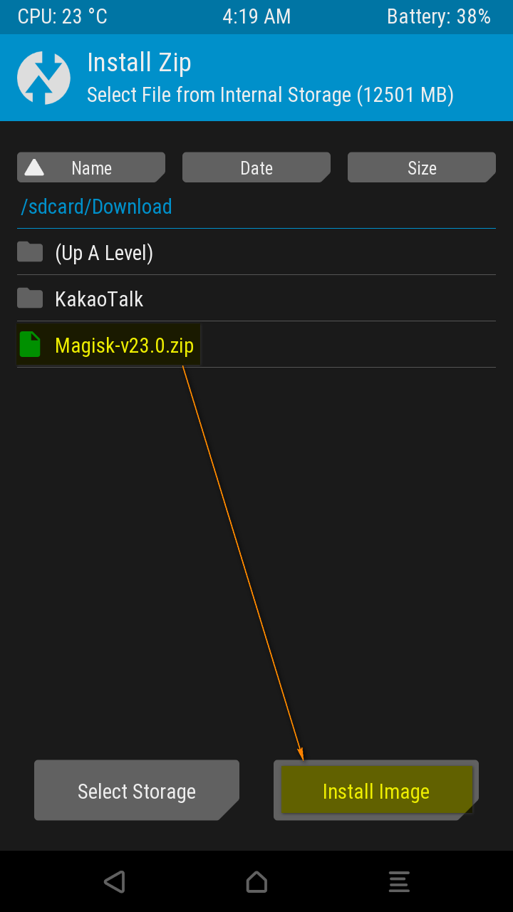 먼저 저장해 둔 'Magisk-v##.#.zip' 파일을 선택한 후 'Install Image' 버튼을 누릅니다.