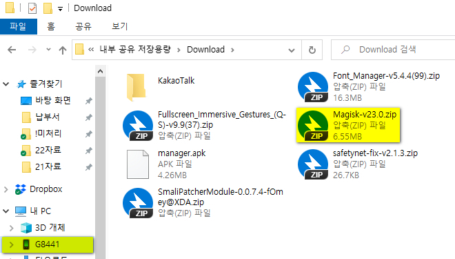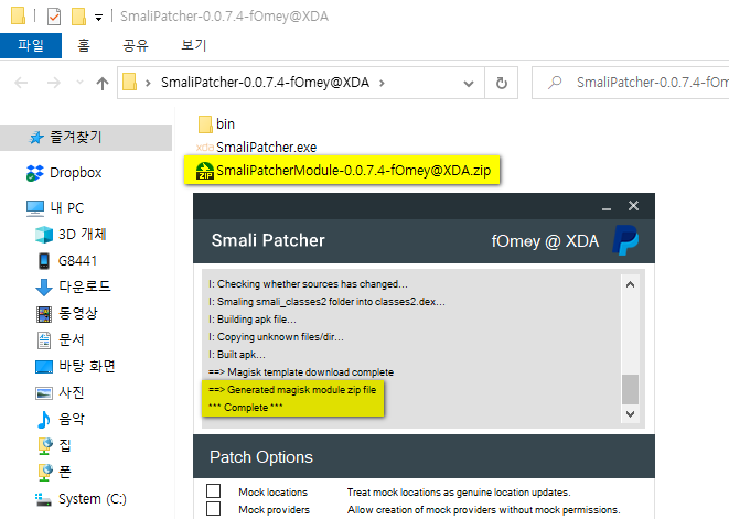 Smali Patcher에서 위와 같은 메시지가 나오면 원래의 실행파일이 있던 위치에 위와 같이 'SmaliPatcherModule-0.0.#.#-fOmey@XDA.zip' 라고하는 Magisk용 모듈 이미지가 생깁니다.