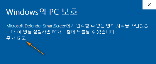 윈도우즈 10의 경우 바로 실행이 되지 않을 수 있는데, 이런 화면이 나오면 '추가 정보'를 누릅니다.