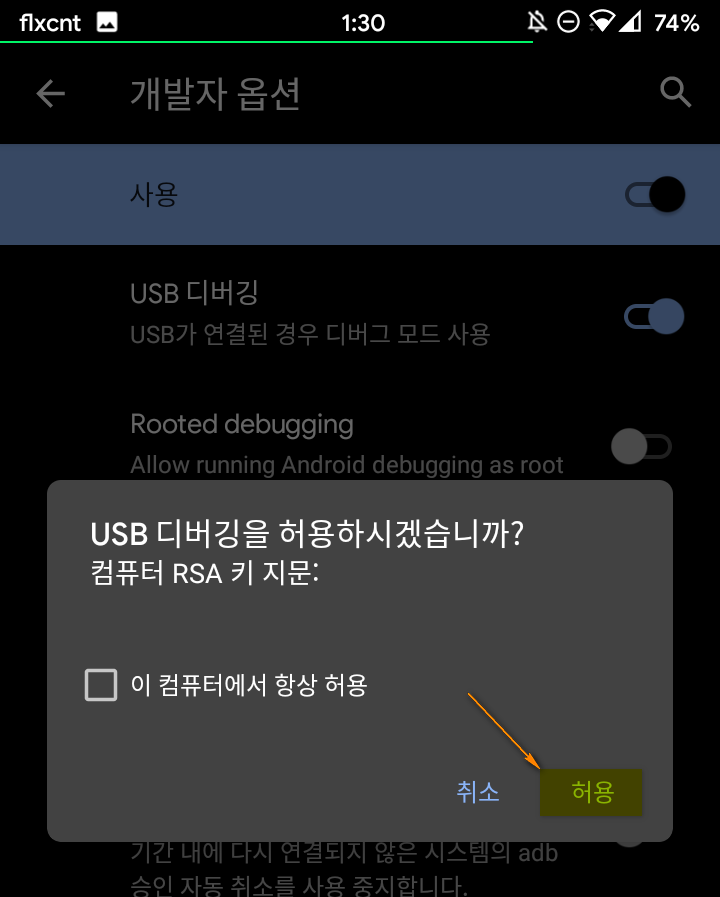 휴대전화에서 'USB 디버깅을 허용하겠냐는 메시지가 나옵니다. '허용'을 해줍니다.