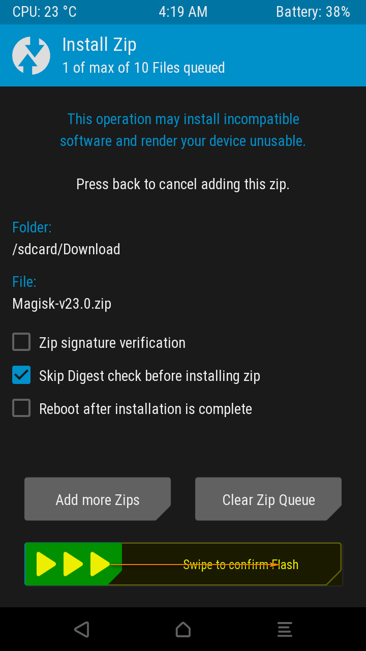 'Swipe to confirm Flash' 부분을 스와이프 하여 Magisk 이미지를 설치합니다.
