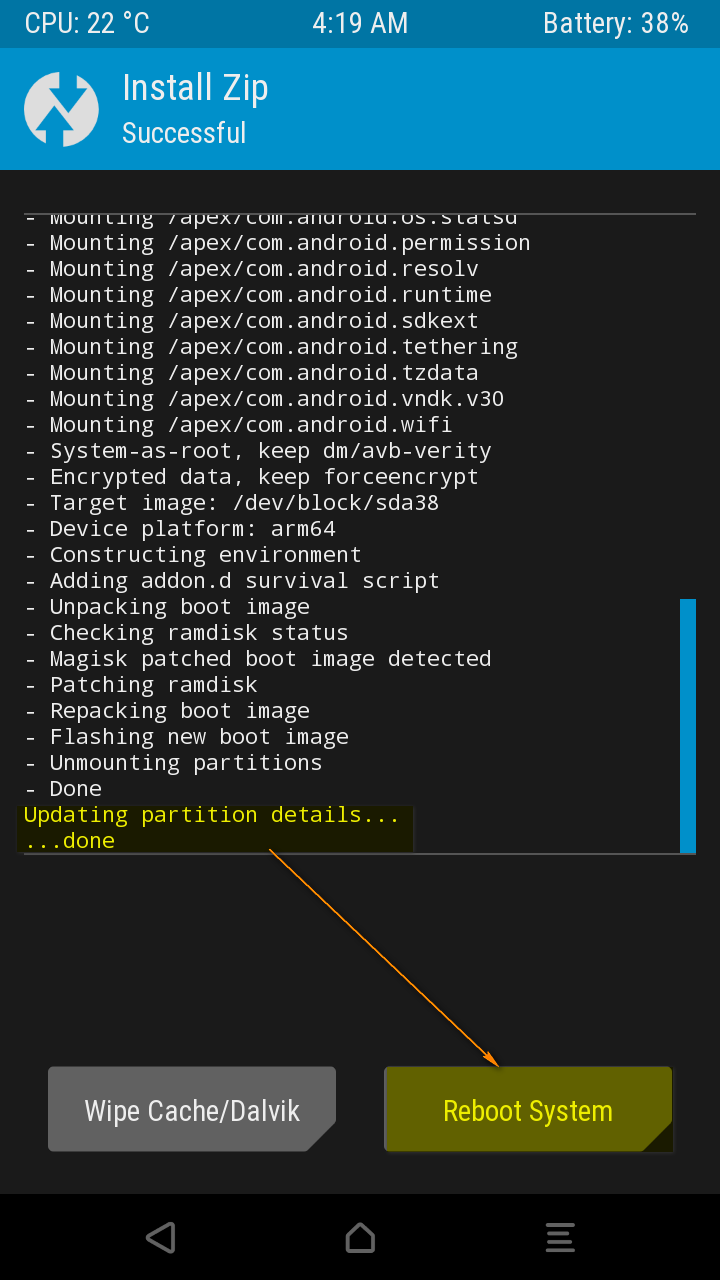 이후 생성된 압축파일을 다시 커스텀 리커버리로 진입하여 설치해준 후 기기를 재시작합니다.