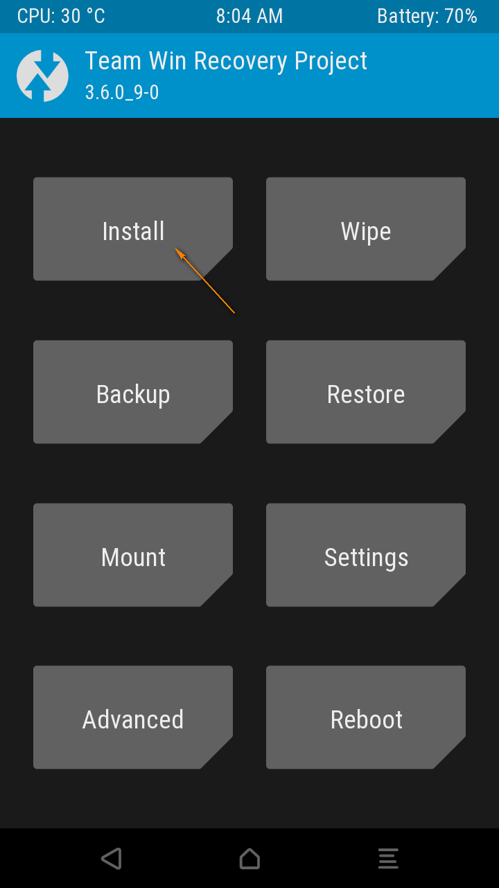 커스텀 리커버리로 진입하여 'Install'을 선택합니다.